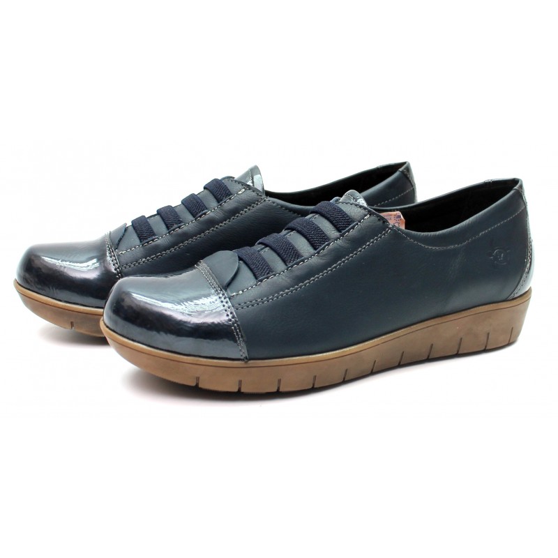 Γυναικείο δερμάτινο παπούτσι σε συνδυασμό δέρμα και λουστρίν, με λάστιχο-κορδόνι και ποντίνι.